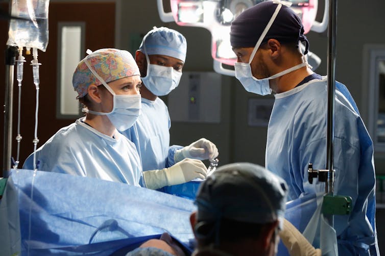 Grey’s Anatomy, the longest running prime-time medical drama on U.S. television, contains many scenes of doctors and nurses in full gear (hospital scrubs, surgical caps, face masks) around the operating table. As they talk, laugh and argue, close-ups of the actors’ eyes convey concentration and emotion.