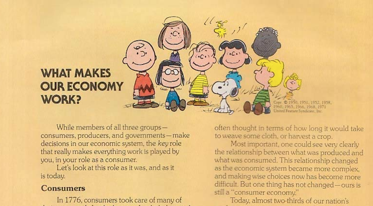 That booklet used data provided by the departments of Commerce and Labor and Charles Schulz’s ‘Peanuts’ comic strips to explain the benefits of America’s economic system. The system was again presented as a foundational freedom protected by a Constitution whose goal was to “maintain a climate in which people could work, invest, and prosper.”