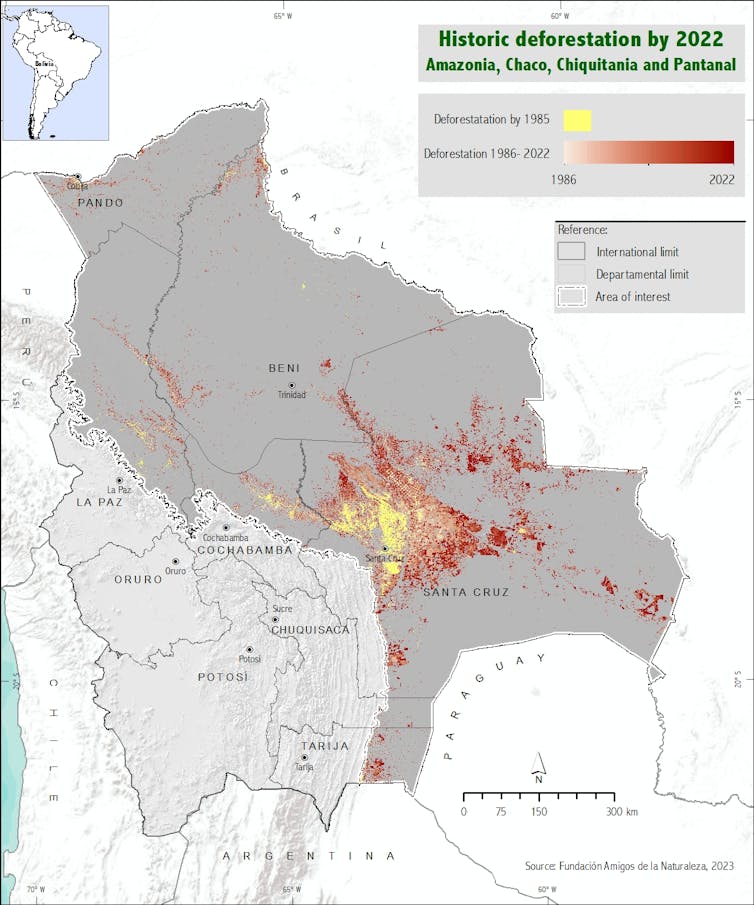 Bolivia is not only at the centre of the current international rush for lithium. It is also one of the world leaders in deforestation. According to Global Forest Watch, the country lost more than 3,3 million hectares of humid primary forest from 2002 to 2021 to deforestation, or the equivalent of 4 million soccer fields, with an exponential growth in deforestation rates of more than 5.5% per year over the last two decades.