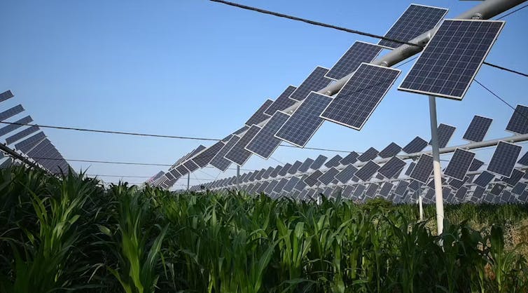 In Europe, solar panels are put over different types of crops, including fruit trees. Meanwhile, in China, agrivoltaics is used to reverse desertification which is literally using solar panels to green former deserts.