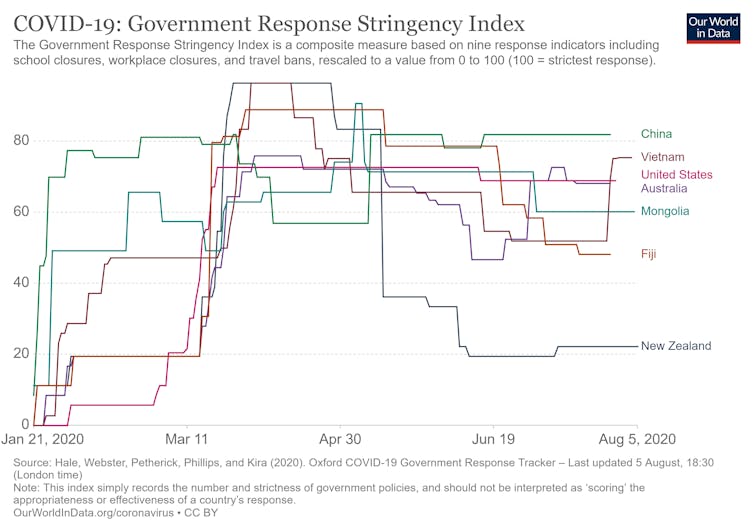 New Zealand is one of a small number of jurisdictions – including mainland China, Hong Kong, Taiwan, South Korea, Vietnam, Mongolia, Australia and Fiji – pursuing COVID-19 containment or elimination. Most have had new outbreaks. The exceptions are Taiwan, Mongolia, Fiji and New Zealand.