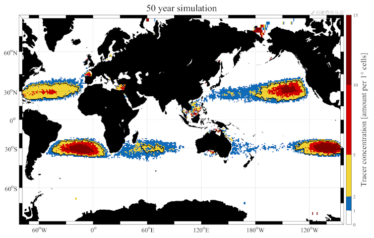 Around 1% of plastic waste accumulates in five subtropical “garbage patches” in the open ocean. They’re formed as a result of ocean circulation, driven by the changing wind fields and the Earth’s rotation.
